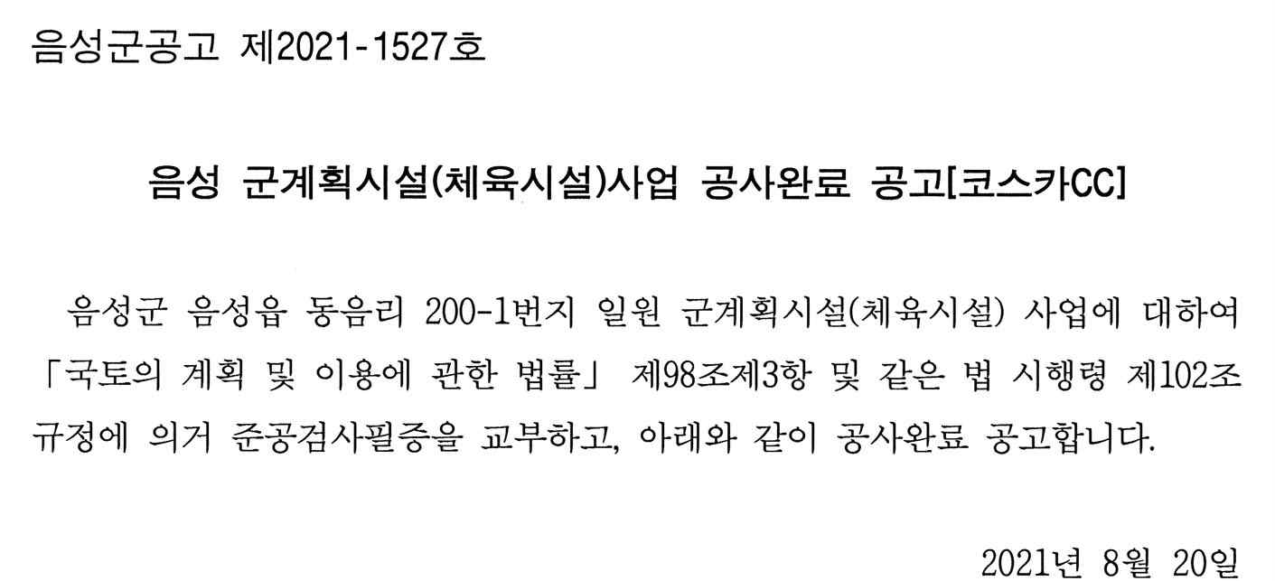충북 음성군 음성읍 동음리에 코스카 컨드리클럽이 운영되던중 확장증설해서 완공되었네요