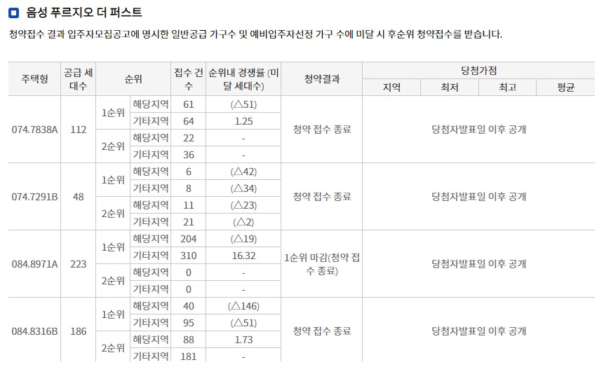 음성군 대소면 성본리의 성본산업단지 내에 건설되어 지는 대우건설 음성푸르지오더퍼스트 아파트 청약경쟁률 현황입니다.